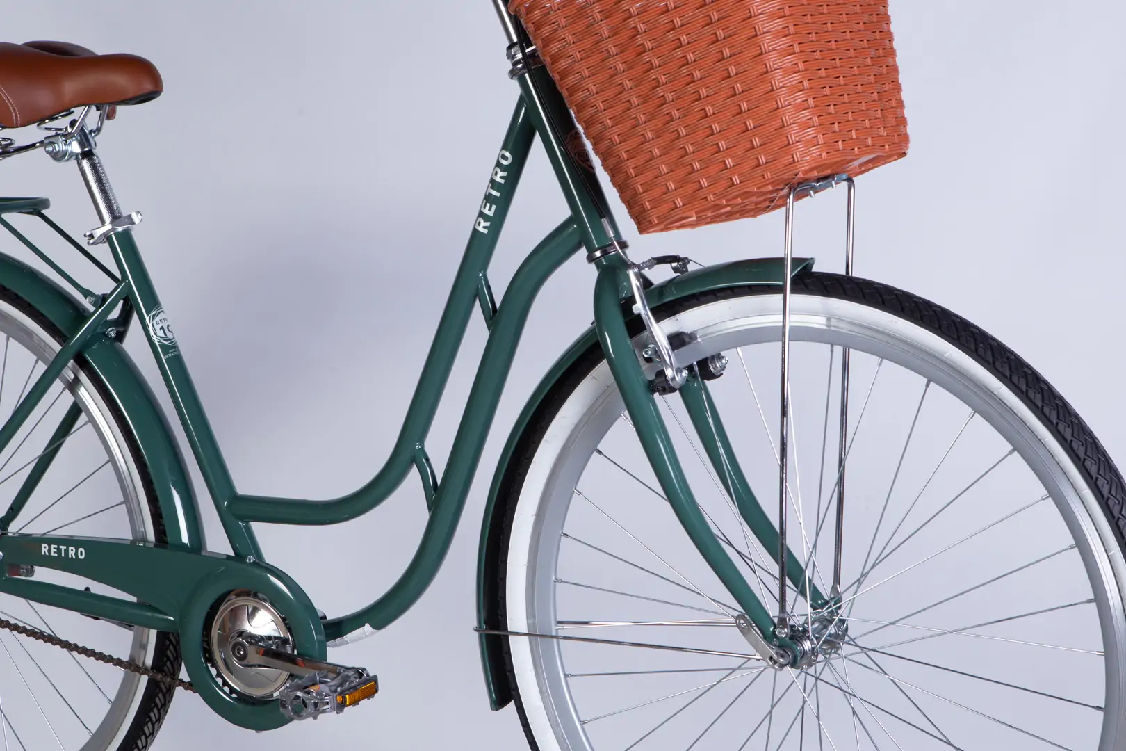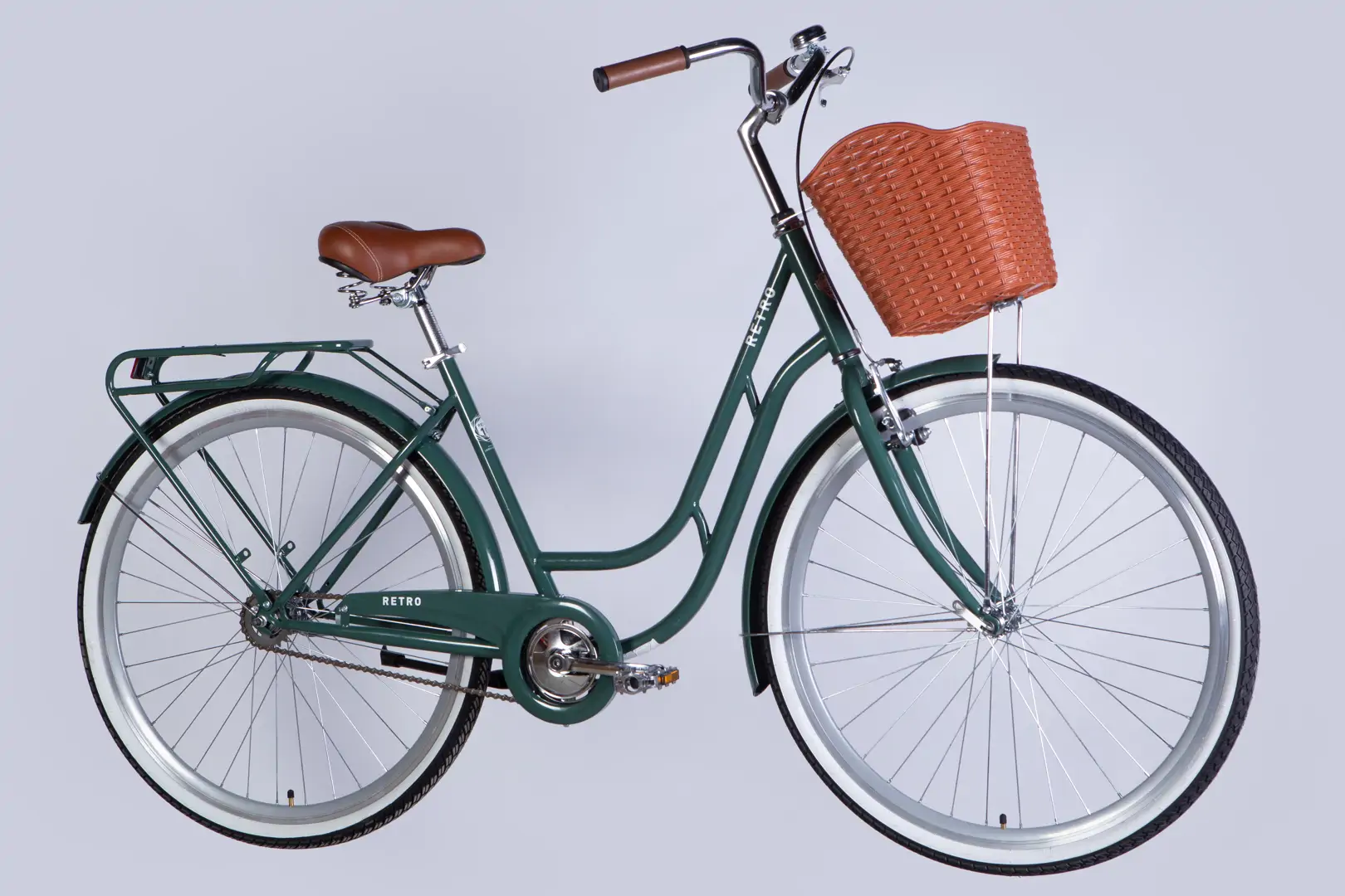 Велосипед Dorozhnik RETRO 28″ міський жіночий з кошиком рама-19″ високоміцна сталь зелено-сірий