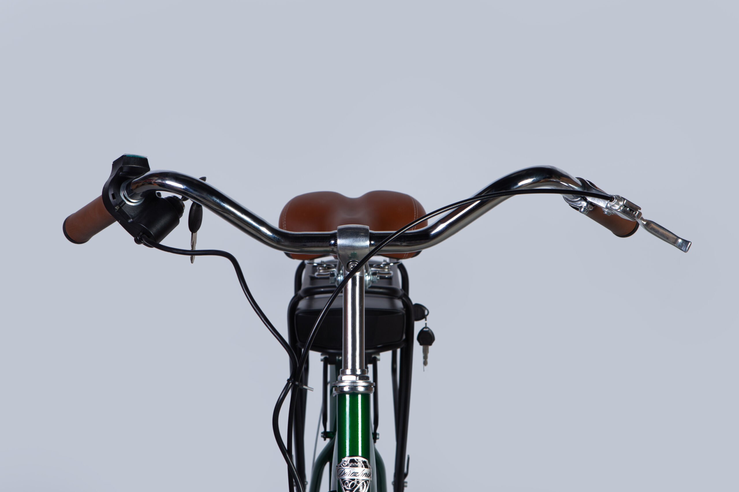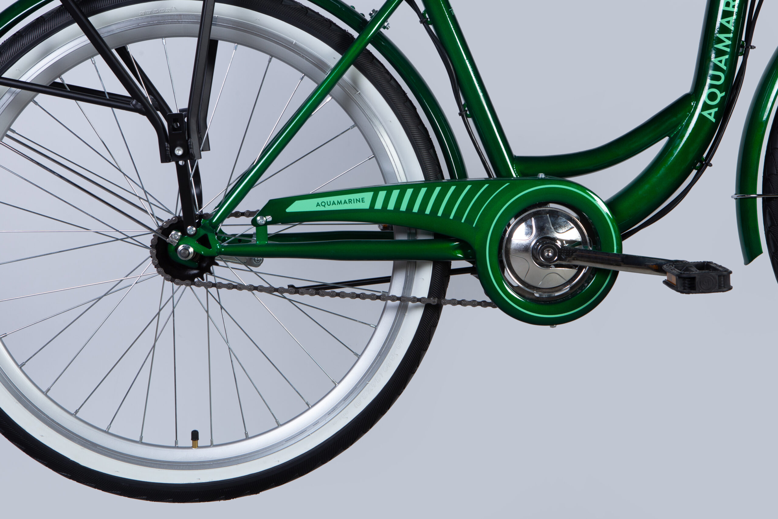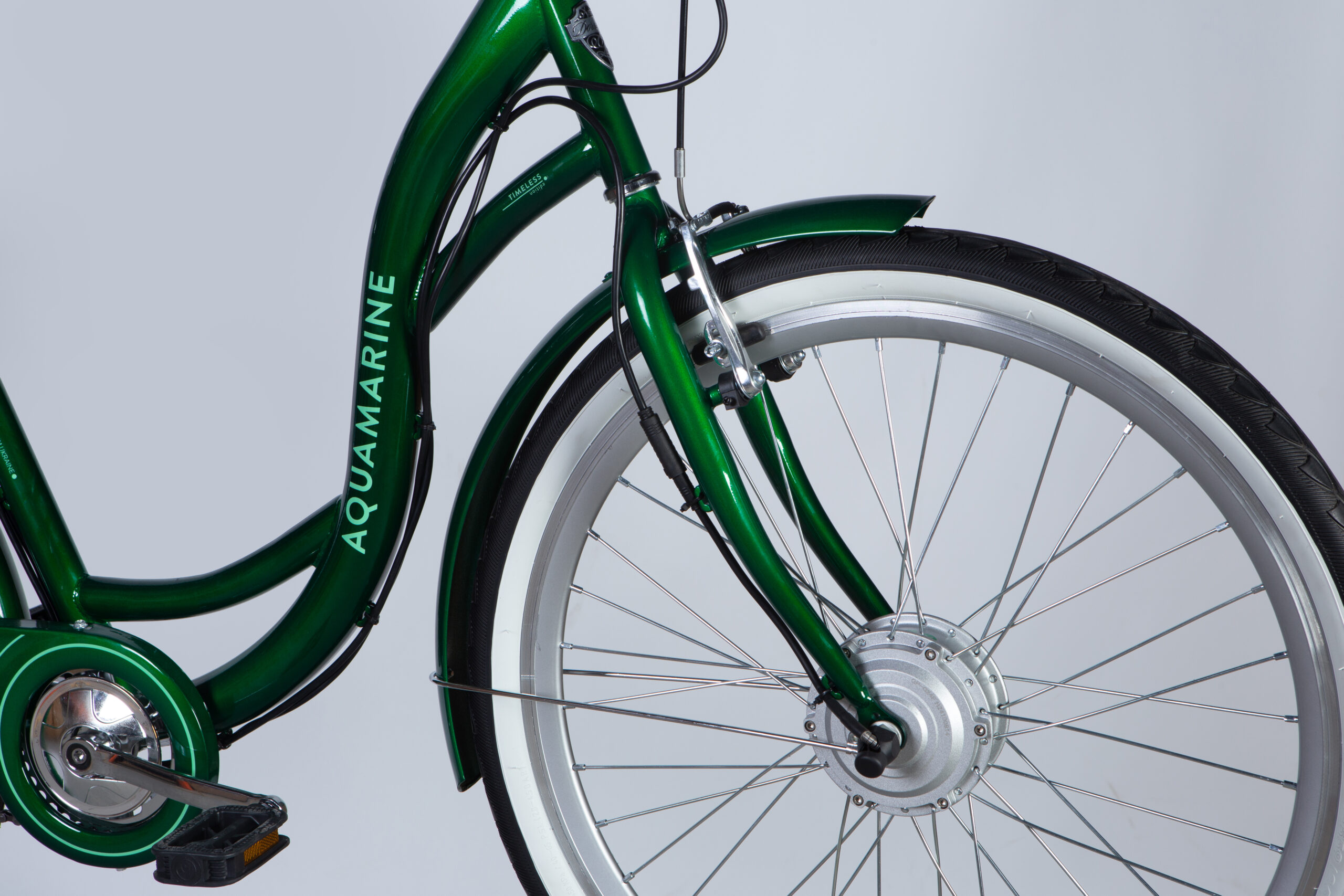 Дизайн eAQUAMARINE привертає увагу: зелене забарвлення зі стильними акцентами, що додає цьому велосипеда унікального вигляду. Також, він оснащений зручними крилами, щоб не боятися зіпсувати одяг у дощову погоду. Центральна підніжка зробить ваші зупинки зручнішими.